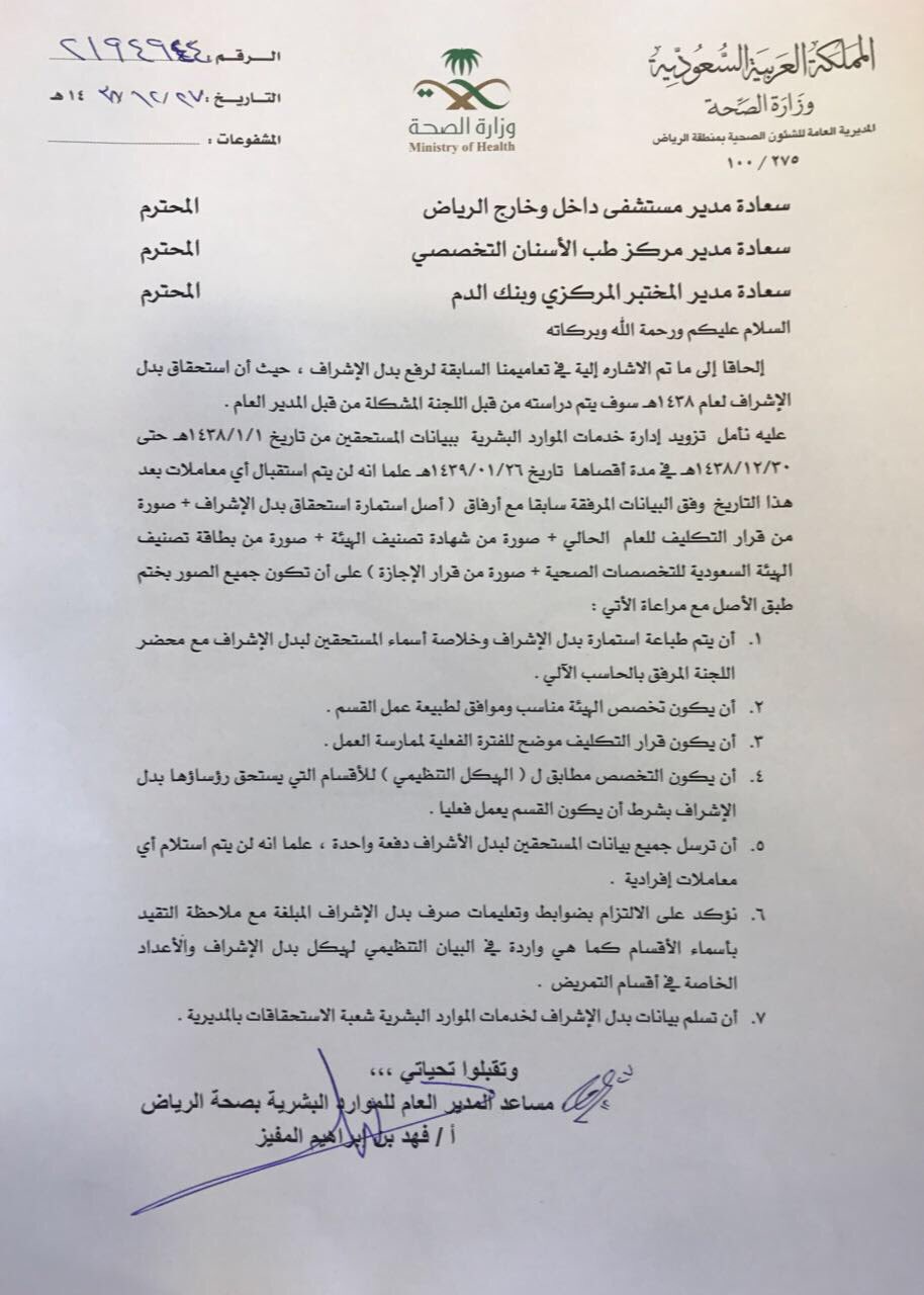 م ن س و ب ي وزارة ا ل ص ح ة A Twitter تعميم بدل الاشراف لسنة 1438 صحة الرياض